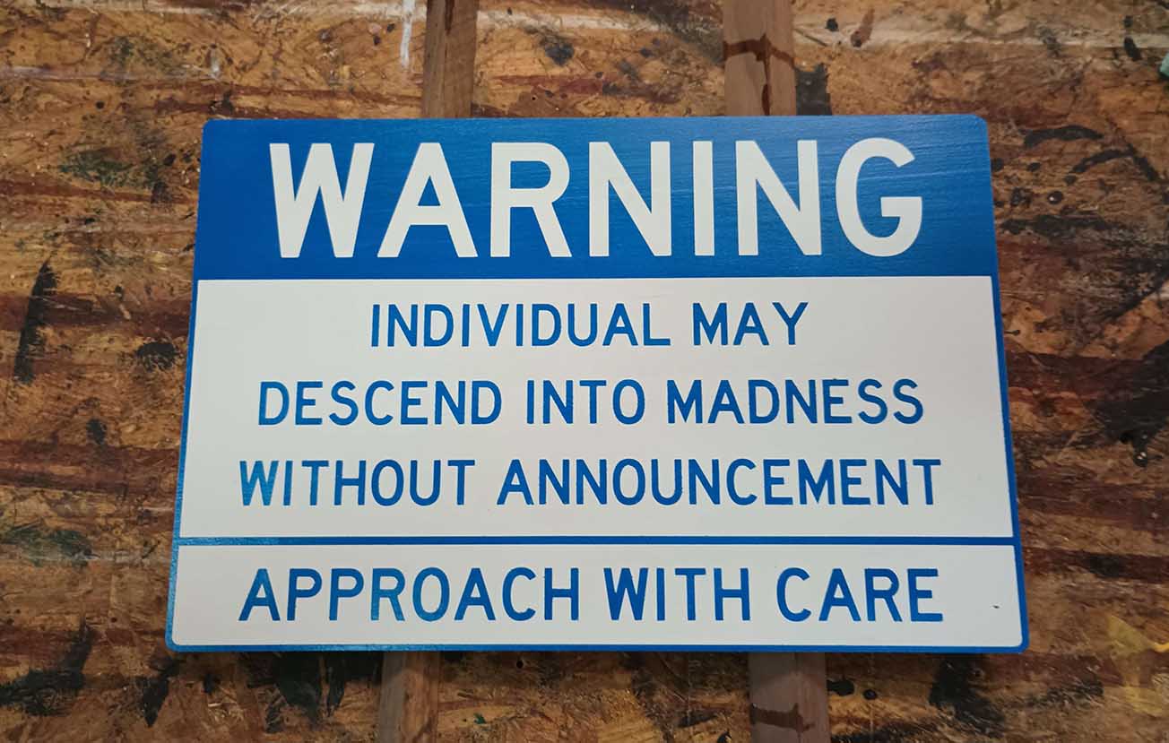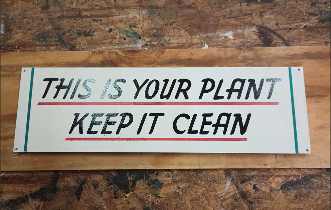 This sign is based on a cardboard poster that was found in a steel mill in Pittsburgh, PA.