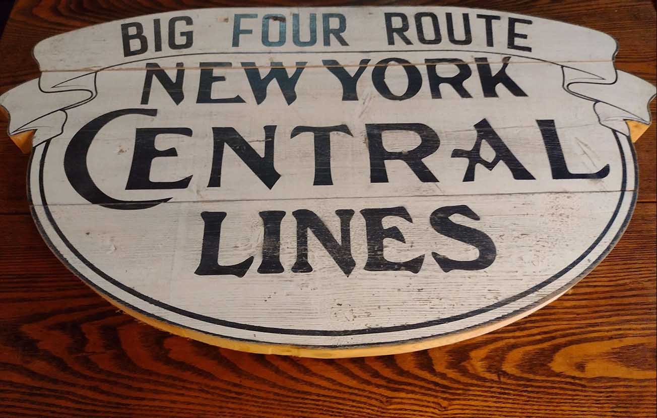 New York Central R.R. sign garnished with a "Big Four Route" banner. Made of heavy pine.