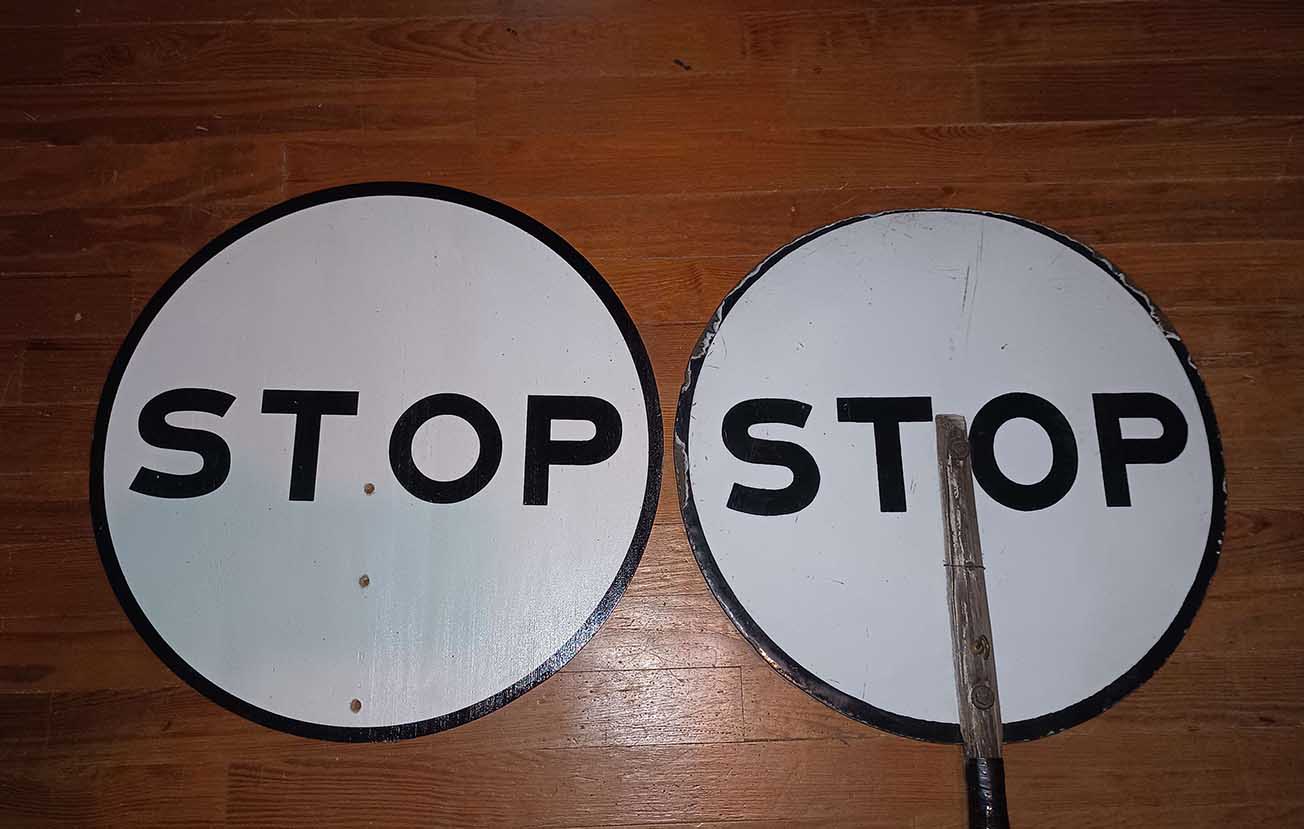 Nickel Plate Road Style R.R. Crossing Watchman sign. Replica (Left). Original (Right).